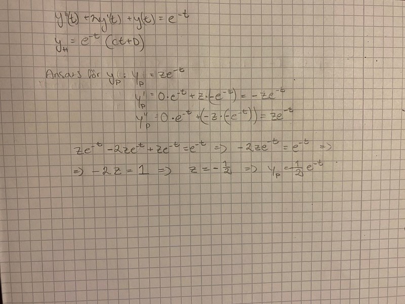 Vi får efter lite arbete att e-tz’’(t) = e-t, vilket ger att z’’(t) = 1, vilket ger z(t) = t2/2.