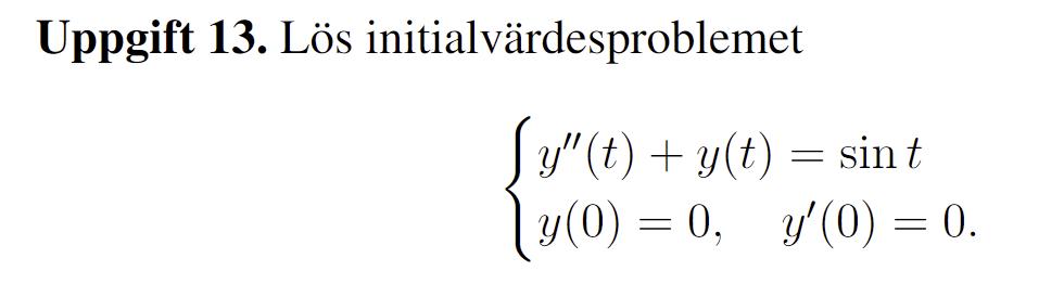 Jag har fått homogena lösningen , då det borde vara lösningen till svängnings ekvationen. Jag ansätter sedan som partikulär lösning för att försöka hitta a och b. När jag sedan räknar det och sätter det lika sin(t) får jag dock att 0 = sin(t). Hur ska man tänka här?