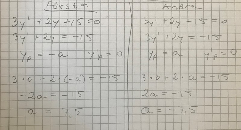 när jag sen ska sätta y(partikulär) = a, ska man inte sätta -a eftersom det är -15 eller ska det alltid vara positivt?