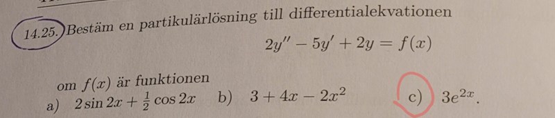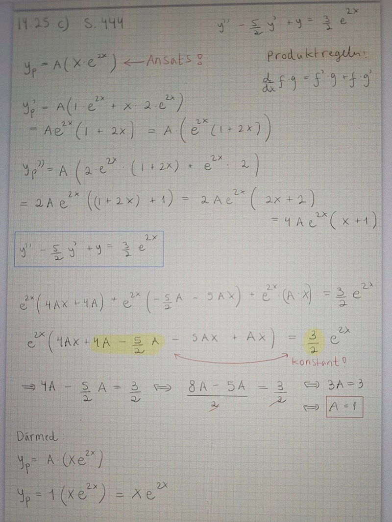 Jag har en liten fundering gällande det som är gult. Jag har ju brutit ut e^2x så då borde det som är i parentesen i VL vara lika med 3/2 i HL. Men nu så är 3/2 en konstant och då borde jag även bara ta ut konstanterna från parentesen i VL?