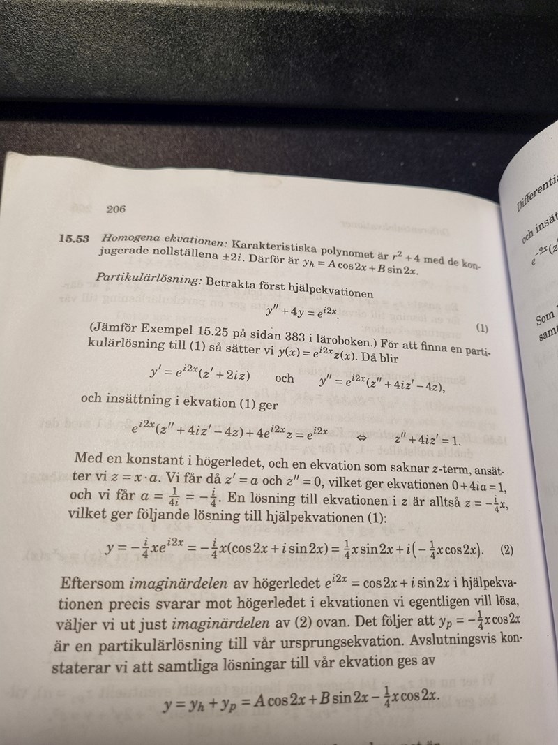 Jag har jobbat mig igenom det likt lösningen nedan. Det tar dock stopp vid sista stycket där partikulärlösningen till y ska tas fram. Vad innebär det att hjälplösningen svarar mot högerledet i ekvationen vi vill lösa? Varför går det då att dra slutsatsen att yp=-1/4xcos2x?
