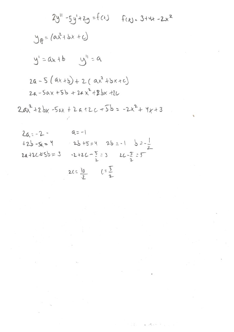 Hej! Jag har trasslat in mig lite i en partikulärlösning, uppgiften är att bestämma en partikulärlösning till ekvationen 2y’’-5y’+2y = f(x) om f(x) = 3+4x-2x2