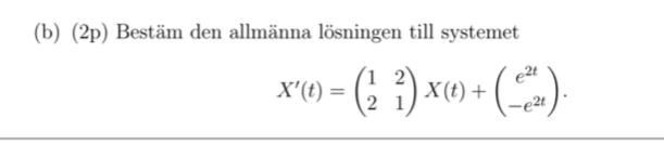 Finns en formel som säger att Xp= fundamentalmatris * integralen (invers av fundamentalmatris * g(t)) där g (t) i detta fall är (e^2t, -e^2t). Får fram fundamentalmatrisen men inversen blev så krånglig och då stannade jag för ville inte behöva göra så krångliga beräkningar om jag är osäker på metoden. Hoppas någon vet hur man löser denna