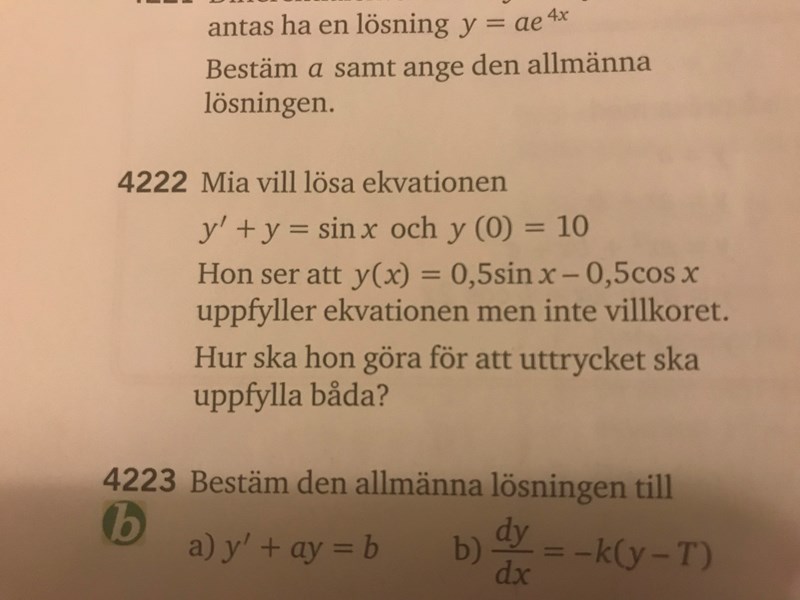 utan att lyckas, förstår hur man får fram den allmänna homogena lösningen men det är just då jag ska byta ut y mot ”a sin x + b cos x” som jag kör fast. Får till deriveringen men vet inte hur jag ska kunna få ut ”värden” på a och b..