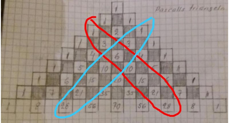 Mina inringade sneda rader innehåller antalet kulor i varje lager