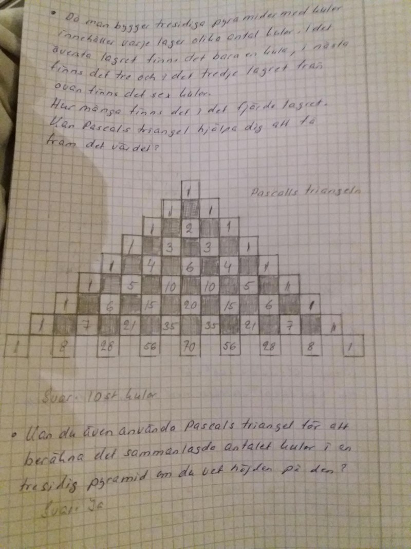 Du har svarat "ja" på att det går att räkna ut antalet kulor i pyramiden med Pascals triangel, så jag undrar hur du gör det. Eller skrev du av facit?