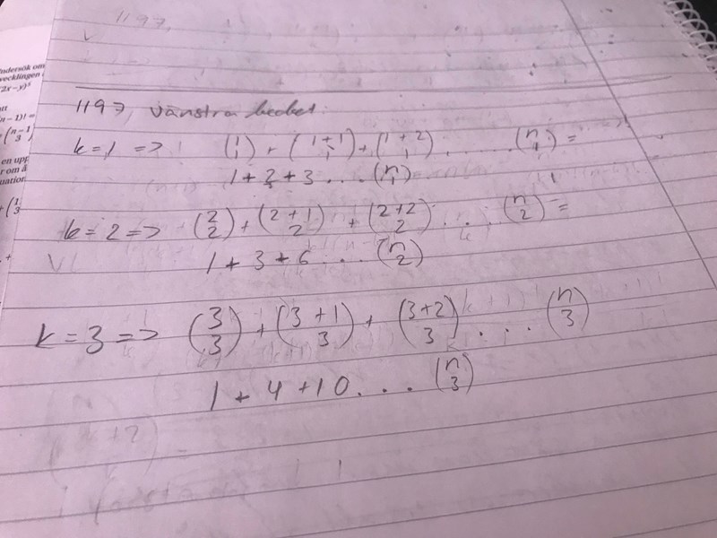Vad gör jag för fel? Jag ser att det läggs till +1 i den övre men räknar jag fel på den nedre? Skulle vara enklare om jag kunde göra om till fakultet men förstår inte hur jag ska ställa upp det vänstra ledet i det..