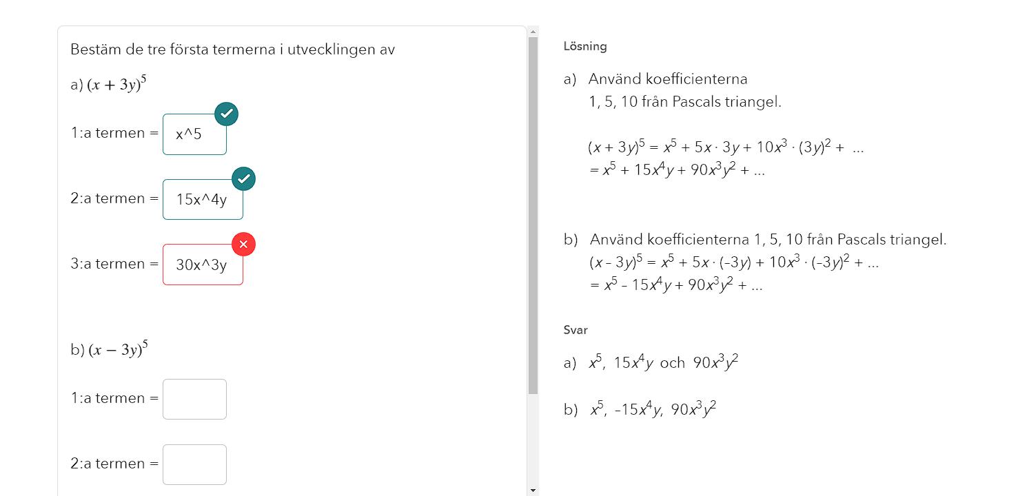 Du ska ta reda på tredje termen i ett binom som är upphöjt till fem.