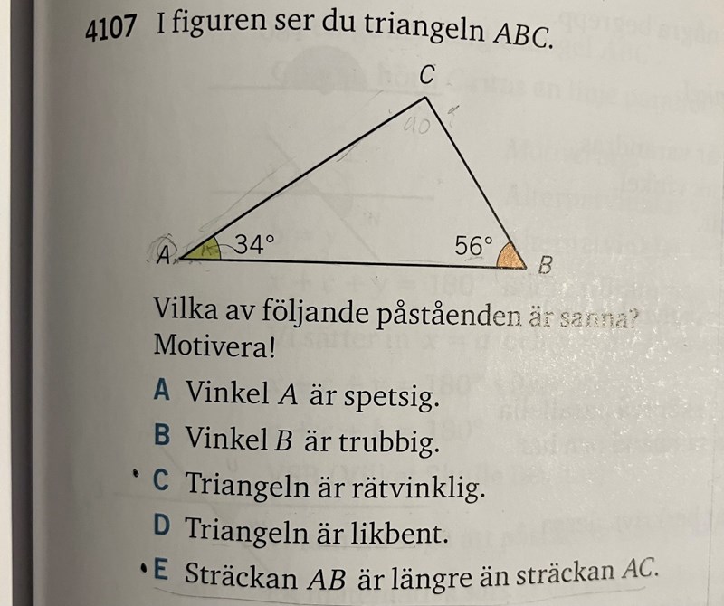 Jag har kommit fram från att vinkel C är 90 grader,  ett abstrakt sätt att lösa är att låta sträckan AC närma sig sträcka AB och sen uppskatta vilken är längst.