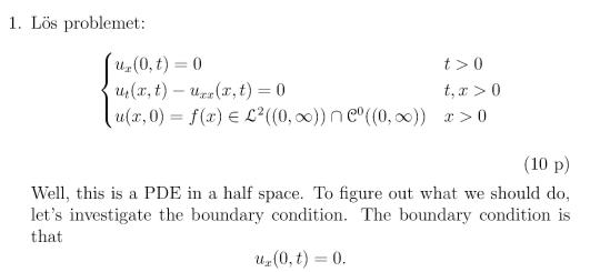Denna PDE kallas för värmeledningsekvationen. Ekvationen består av ett så kallat "half-space" problem eftersom den är definierad för x>0, vilket innebär att den är begränsad till halva linjen. Detta är typiskt för värmeledningsproblem där det finns symmetri eller isolering vid x=0. Villkor 1 är randvillkor och villkor 3 är initialvillkor, medan villkor 2 är själva PDE. Dessa problem brukar oftast lösas med variabelseparation genom att ansätta U(x,t)=X(x)T(t)U(x, t) = X(x) T(t), därifrån går det att härleda två ordinära differentialekvationer som går att lösa med envariabelanalys: