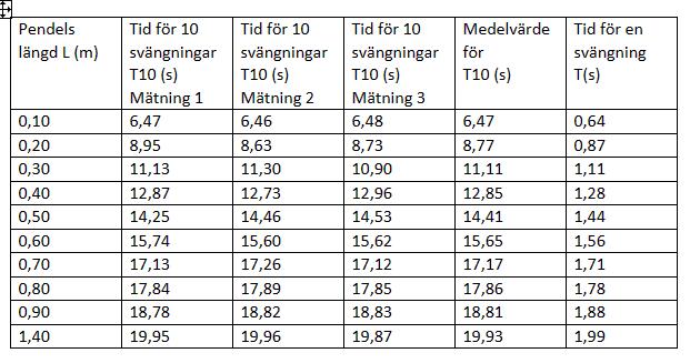 Jag håller på att skriva en labbprotokoll som jag har skrivit halvvägs på hur pendellängden påverkar svängningstiden. Vi fick uppgiften att skapa en tabell och rita ut ett diagram. Det var inga problem för mig att lösa. , Däremot sista uppgiften handlar om att man ska skriva en analys. Där jag skulle dividera den dubbla längden med den ursprungliga längden. Sammanlagt skulle jag räkna och skriva ner 5 stycken kvoter. Svaret från alla de 5 kvoterna ska jag sedan addera ihop och dividera med 5 så att det blir ett medelvärde.