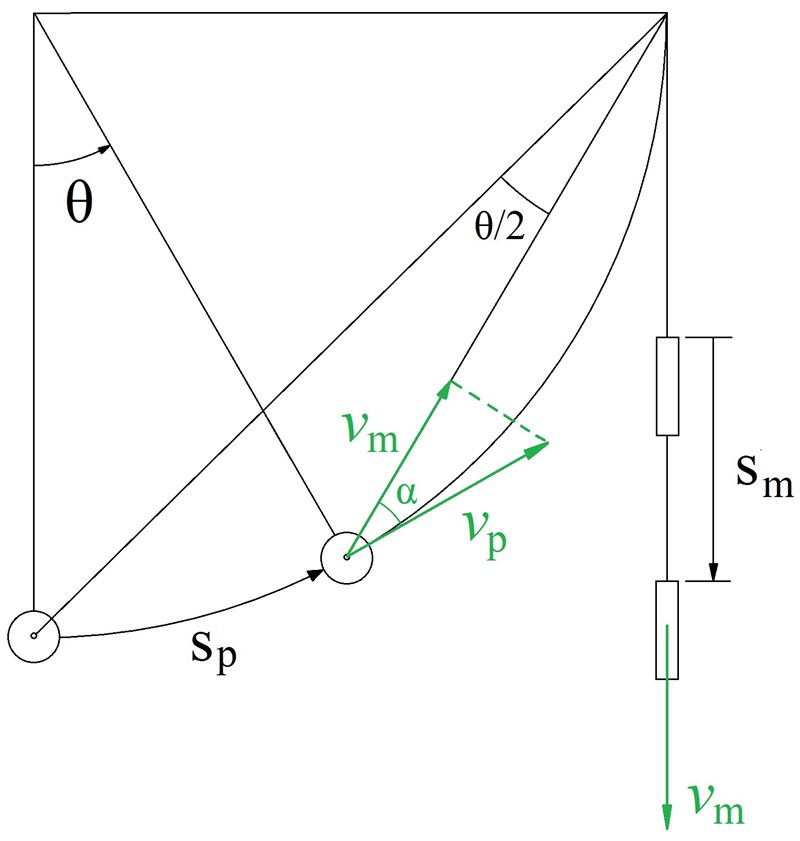 vm=θ˙L·cosπ/4-θ/2\displaystyle v_{m} = \dot{\theta} L \cdot \cos \left(\pi/4 - \theta/2 \right)
