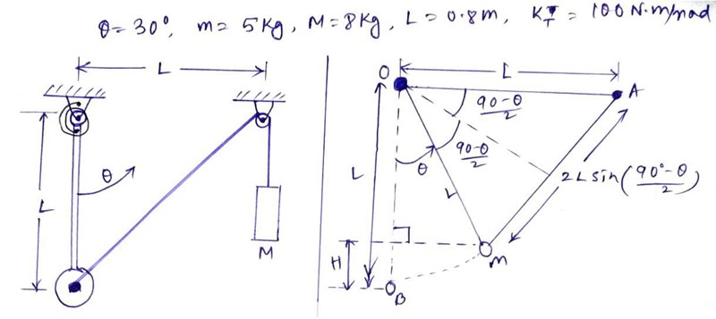 12kTθ2+Mg(2L-2Lsinπ4)=12m(Lθ˙)2+MLθ˙cos(π6)2\frac{1}{2}k_T\theta^2+Mg(\sqrt{2}L-2L\sin\frac{\pi}{4})=\frac{1}{2}\left[m(L\dot{\theta})^2+M\left(L\dot{\theta}\cos(\frac{\pi}{6})\right)^2\right]