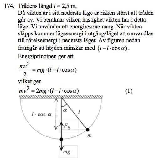 Man hänger upp en 200 grams vikt i en 2,5 m lång sytråd i taket. Vikten dras ut i sidled vinkeln och släpps sedan. Vikten får pendla fram och tillbaka. Vilken är den maximala vinkeln man kan ha utan att tråden går av? Tråden tål kraften 2,5 N.