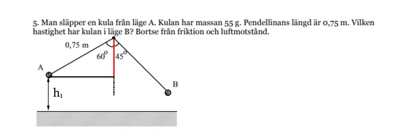 Ture skrev :När kulan går från ett högt till ett lägre läge frigörs lägesenergi som omvandlas till rörelseenergi. Räkna alltså ut hur mycket högra kulan är i det vänstra läget jämfört med det högra. Utnyttja sen energins bevarande.
