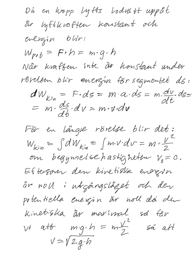 Hej, jag har gjort en laboration om pendeln. Jag fick komplettera en del, läraren sa att jag behöver härleda energiprincipens formel och förklara "ingående" om hur jag kom fram till den. Jag skrev såhär, och tycker det är ok, men skulle gärna vilja veta om ni tycker jag bör lägga till mer. Vad saknas? Ska jag gå in ännu mer på djupet? Eller krånglar jag till det då? För mina kurskamrater gjorde ungefär så här och fick godkänt på labben.
