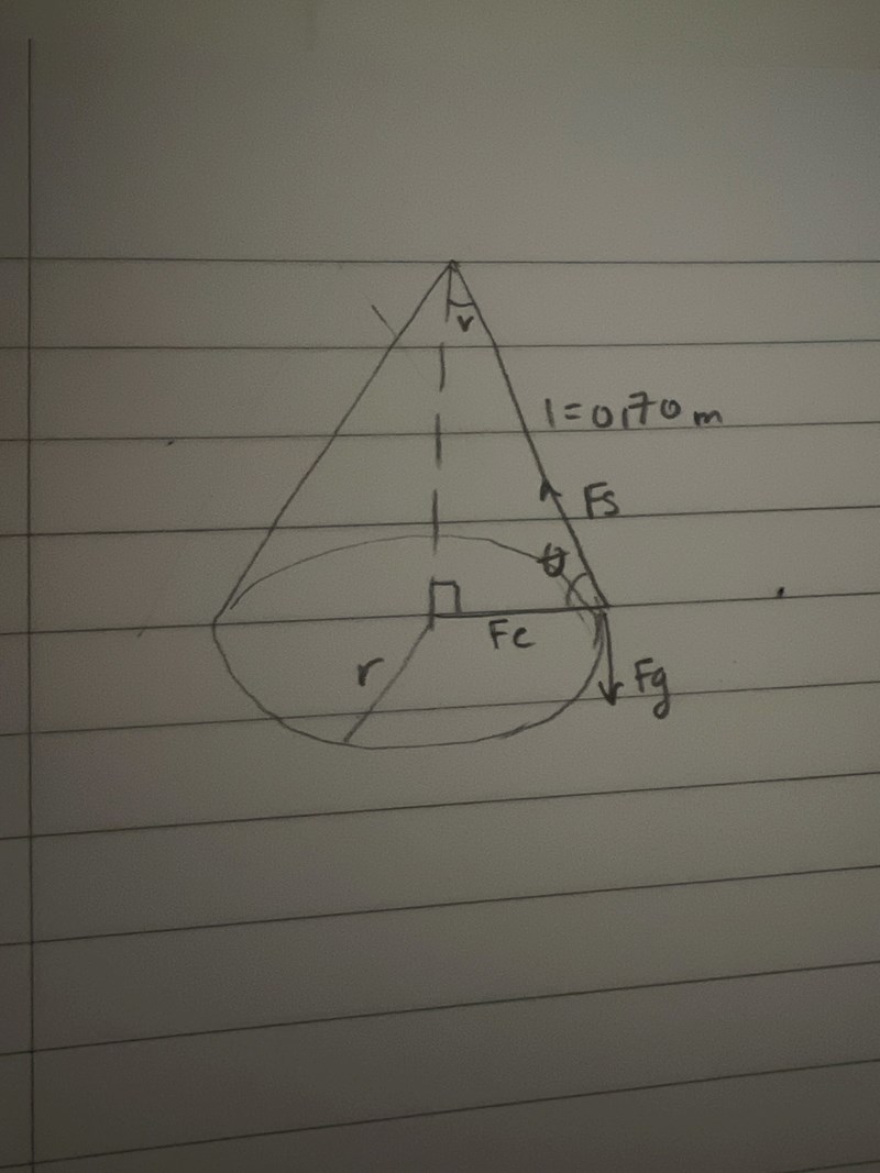 Ture skrev:Soso skrev:En kula är fast i ett snöre med längden 0,70 m. En flicka håller snörets andra ände och snurrar runt kulan med 0,75 varv/s. Kulan kommer då att beskriva en konisk pendel. Vilken vinkel med horisontalplanet kommer denna pendel att bilda ?
