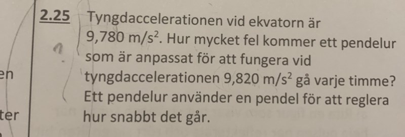Så det dem frågar efter är, om pendeluret visar att det gått 1 timme vid ekvatorn men den är anpassad efter Sverige, hur mycket fel kommer den vara då?