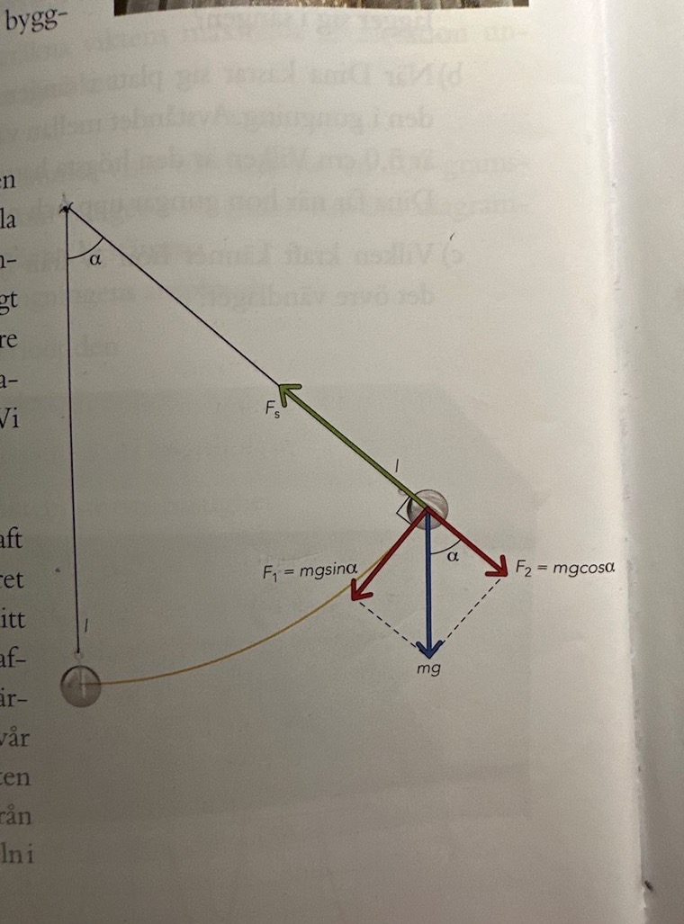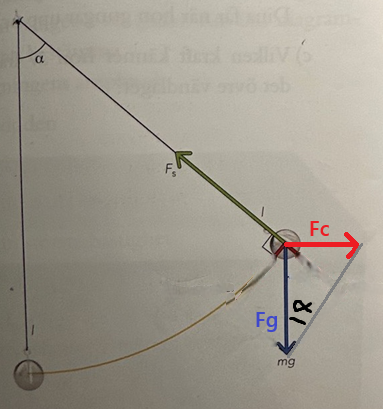 Utan man ska kunna se att kraften i snöret Fs och tyngdkraften Fmg  har en resultatkraft FR.   Och i detta fall är resultatkraft Friktad inåt mot centrum, därav är resultantkraften lika med centripetalkraften, Fc=FR.