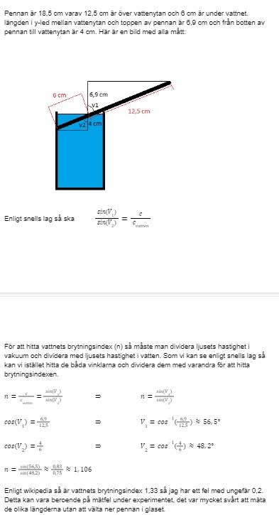 Jag har gjort en uppgift där man ska hitta vattnets brytnings index. Här är uppgiften: