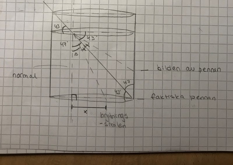 Sedan sade en jag pratade med att ljusets brytning motsvarar pennans brytning, fast då åt andra hållet (mot normalen). Alltså: vinkeln mellan den faktiska pennan och bilden av pennan, är lika stor som vinkeln mellan pennan och brytningsstrålen.