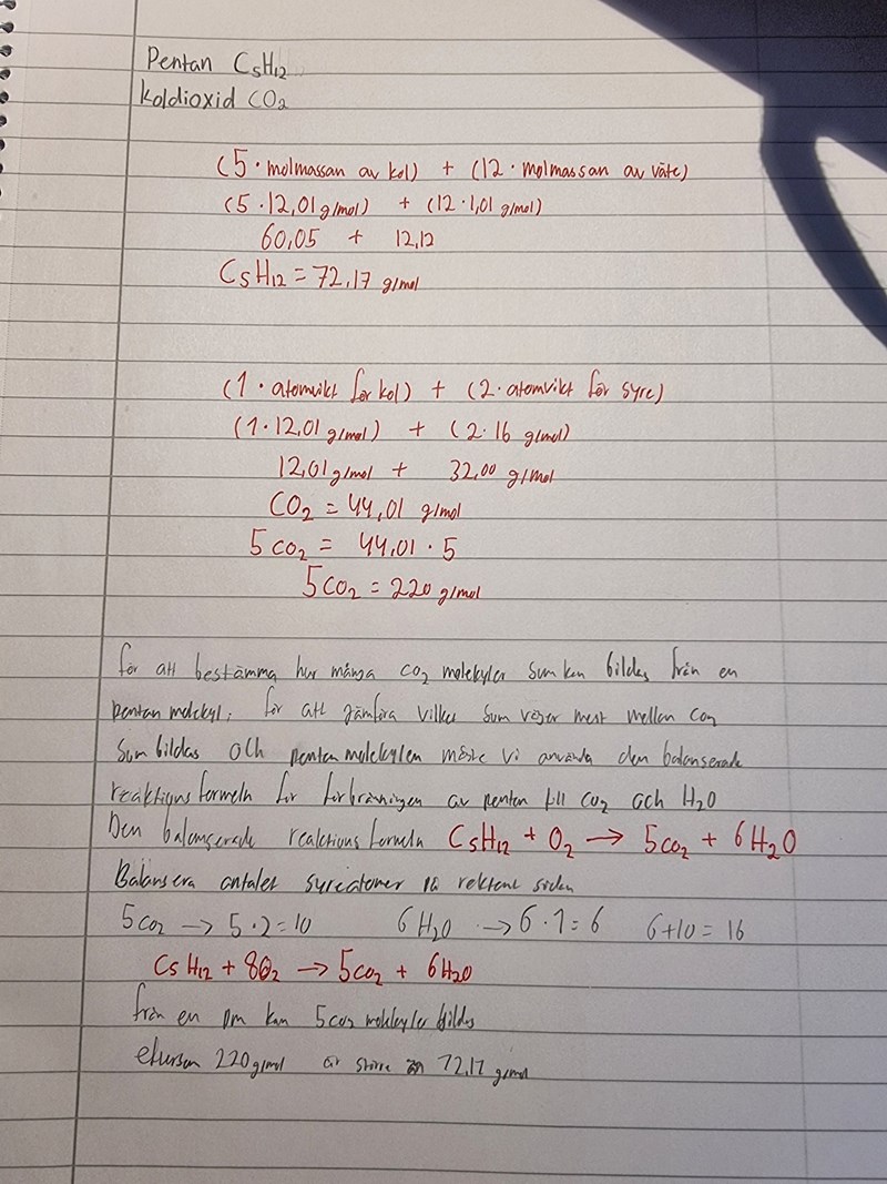 Vilket väger mest, koldioxiden som bildas eller pentanmolekylen?Det saknas