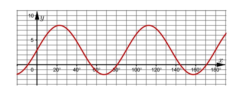 Till och börja med vill vi veta vart funktionen startar. Till och börjamed söker vi "mittlinjen" för funktionen. Den befinner sig på Y-axelns värde 3 eftersom att funktionen går upp 5 enheter och sedan ner 5 enheter från den punkten.