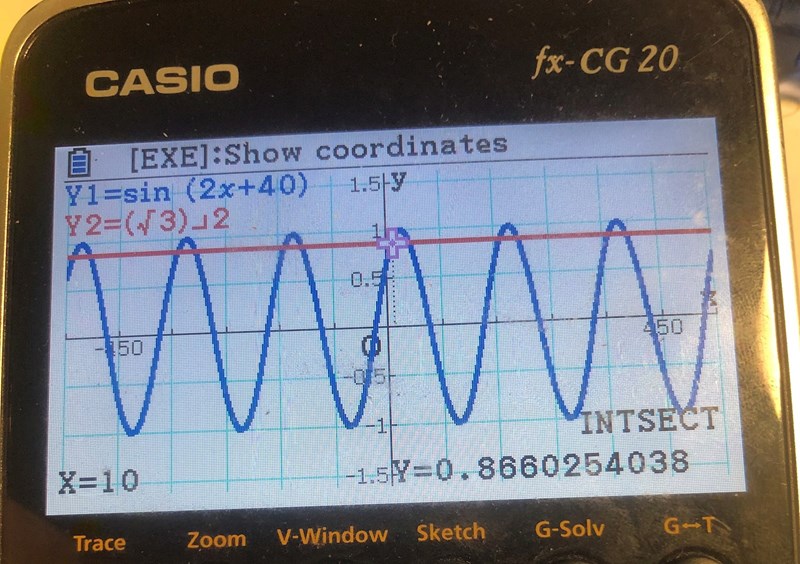 Det du har skrivit är rätt. Var sker nästa skärning efter 10 och 40 grader?