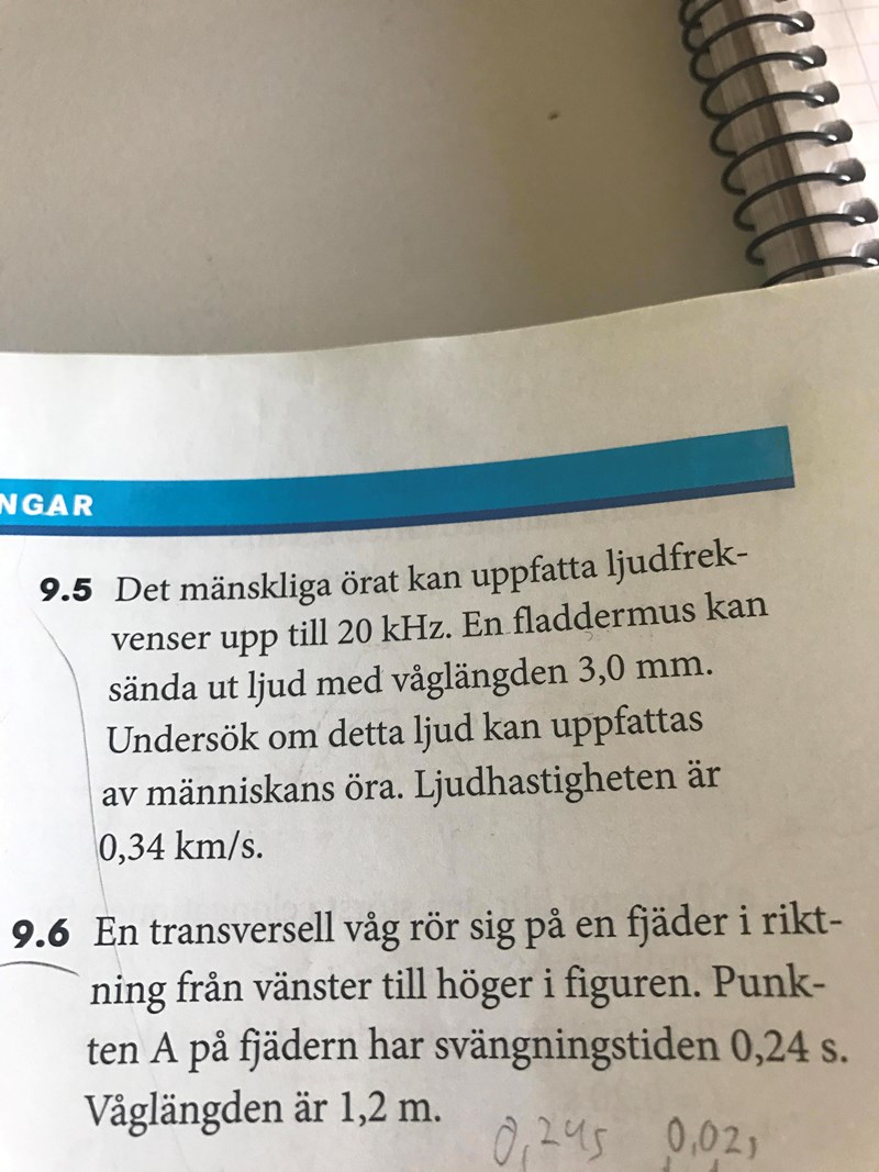 En formel för utbredningshastighet ger att , där lambda är våglängden och f är frekvensen. Om du löser ut f kan du beräkna frekvensen, sedan bedöma om en människa kan höra ljudet eller inte.