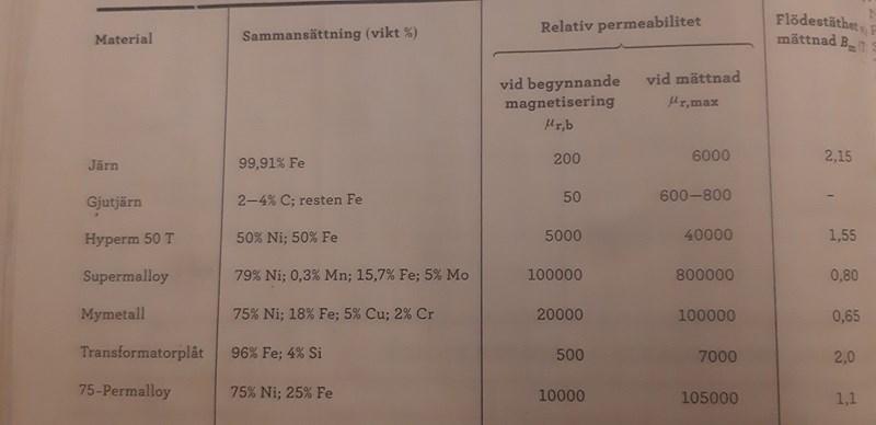 Tabellen är en ingenjörsgrej. Mättnadspermeabilitet kan man använda för att uppskatta hur stor ström behövs för att uppnå mättnadsmagnetisering.