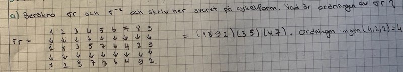 Jag har kommit fram till att svaret är στ =(1 8 9 2)(3 5)(4 7), vilket ger ordningen mgm(4,2,2)=4. Men enligt svarsbladet är svaret στ =(281)(35)(47) och ordningen blir 6.
