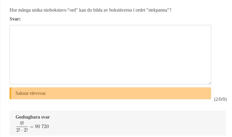 Samma gäller om du har ordet "stekpannan", hur många permutationer har ordet då, om du följer samma metod?