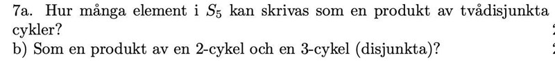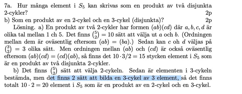 Hej! Jag är fast på fråga 7b. Jag förstår inte riktigt varför det finns 2 sätt att bilda en 3-cykel av 3 element. Jag försökte göra uppgiften som 7a. Alltså en produkt av en 2-cykel och en 3-cykel har formen (ab)(cde) där a, b, c, d, e är olika tal mellan 1 och 5. Som uppgift 7a kommer vi att ha 10 olika sätt att välja ut a och b. Men för att väja ut (cde) fick jag 3 över 3. Men det verkar vara fel. Hur ska man tänka? Tacksam för all förklaring! :)