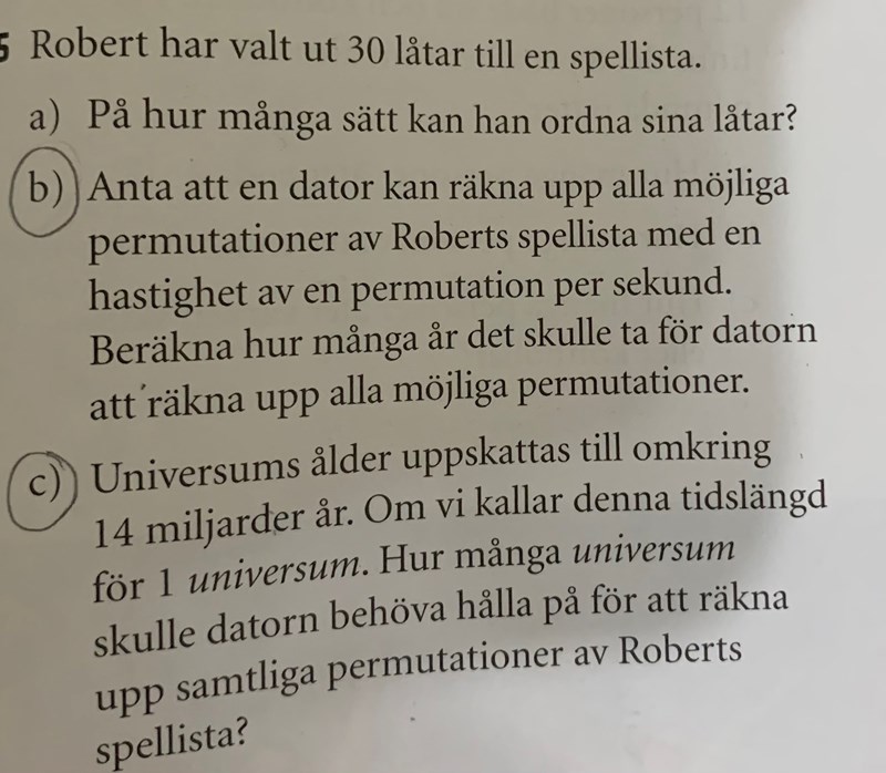 Behöver hjälp med b och c. På a fick jag svaret 30! = 2,7*10^32
