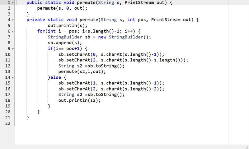 Okej okej, jag tror jag förstår nu. om Jag i loopen byter första bokstaven och en av de andra två och sedan skriver en hjälpfunktion som kan gör permutationer av de två sista skulle jag kanske kunna använda en stringbuilder för att få rätt på det. Jag ger det ett försök.