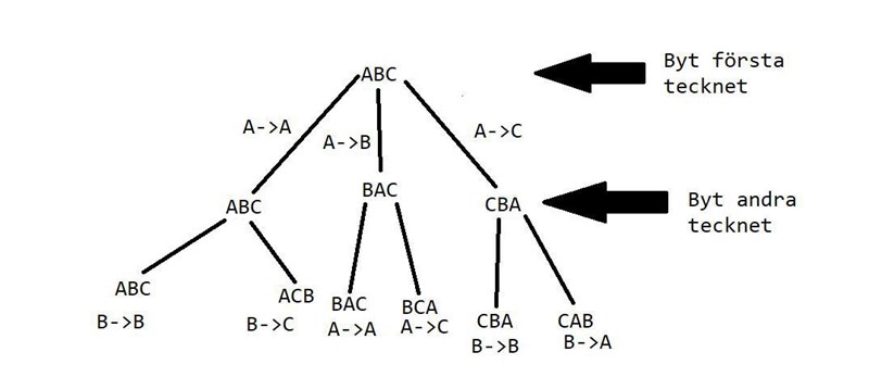 Det som kommer efter första bokstaven är permutationer av *resten* av bokstäverna. Alltså, när första bokstaven är A är de två efter antingen BC eller CB, vilket är permutationerna av B och C. Du kan därför bygga permutationer av längd 3 genom att loopa igenom varje bokstav i strängen, låta den bokstaven vara den första, kalla på en funktion som genererar alla permutationer av resten av bokstäverna, och sen bara sätta fast de kortare permutationerna som en svans efter första bokstaven.