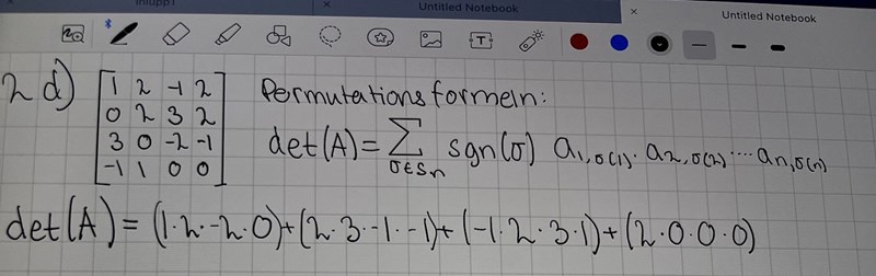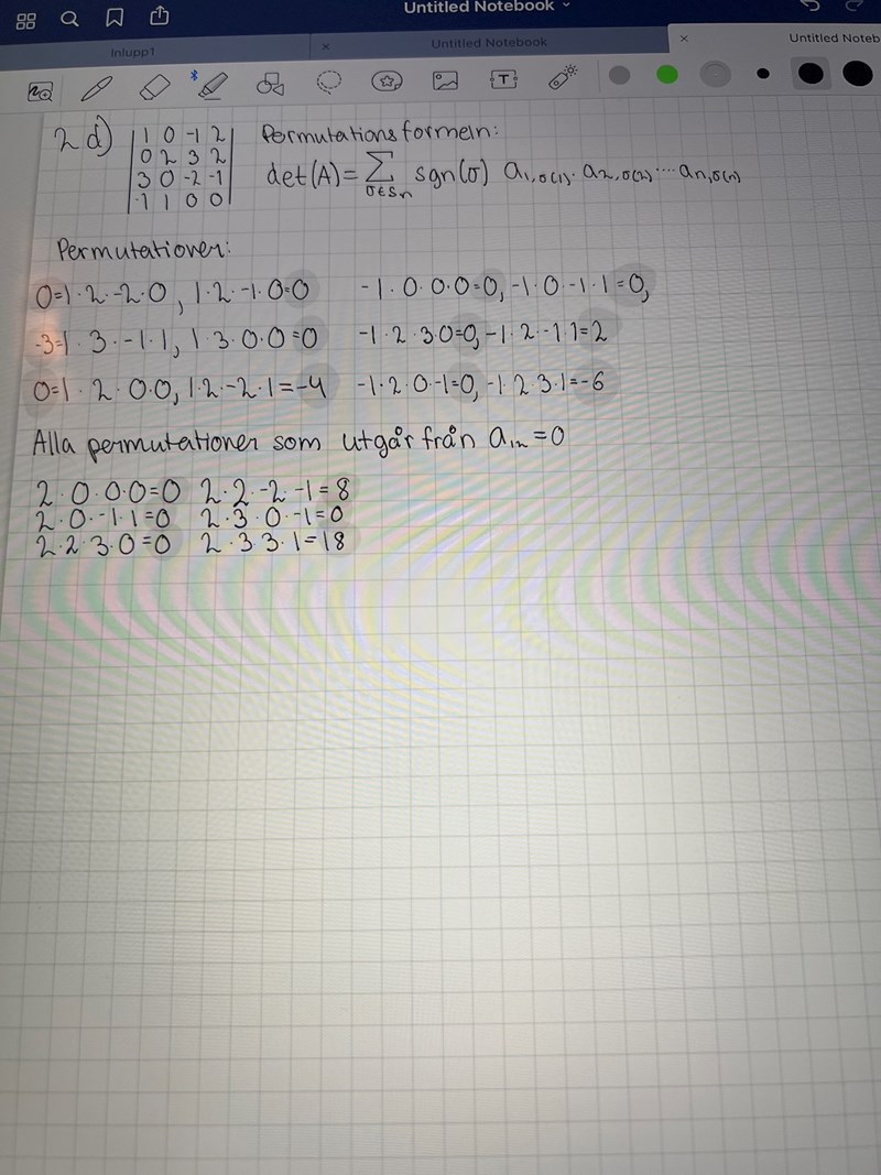 Jag ska beräkna determinanten till denna matris med permuationsformeln vilket jag antar är den jag skrivit här. Problemet är att jag vet inte hur man hittar permutationerna och vet inte vilka värden är det är jag ska multiplicera ihop. Jag tar gärna emot lite hjälp!!