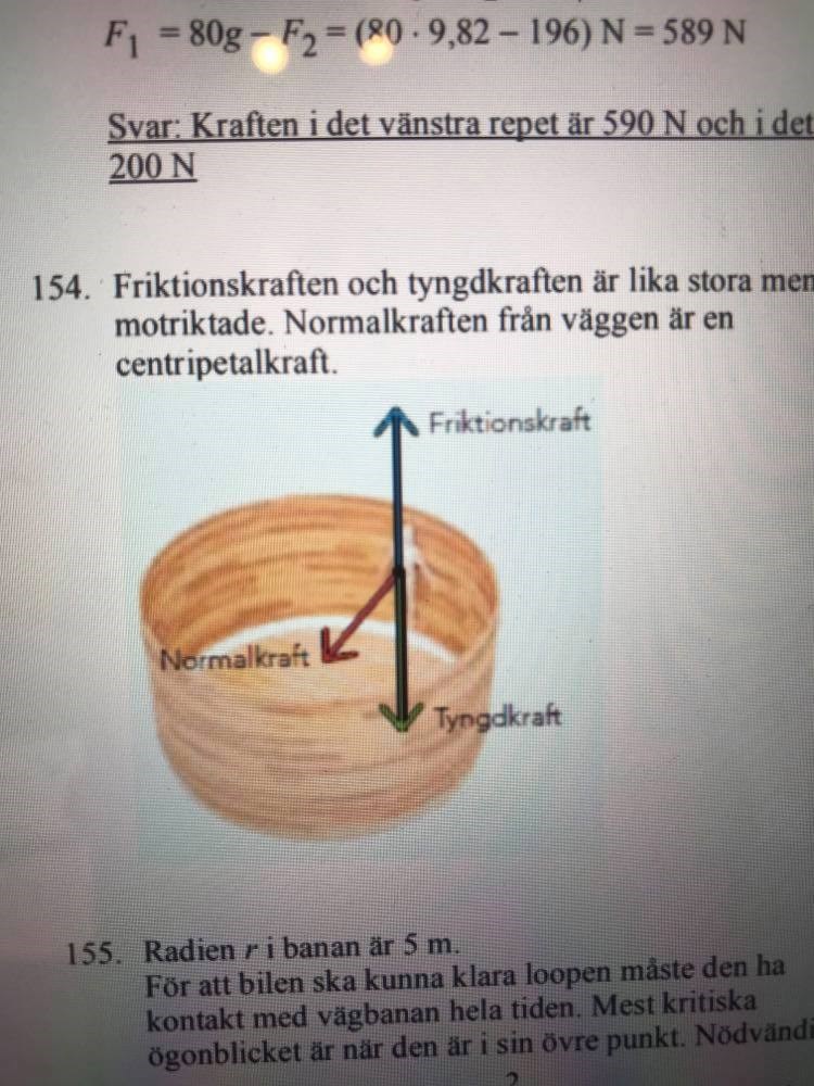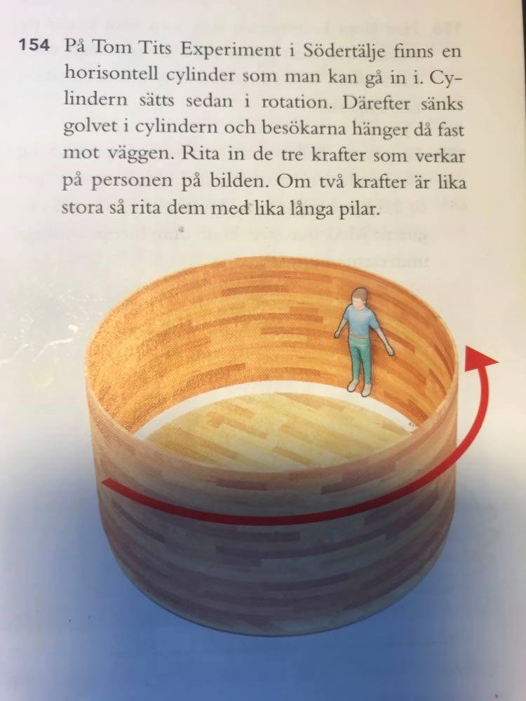 Det viktiga i sammanhanget, tycker jag, är att personen rör sig med hög fart i tangentens riktning, och hindras från att fara iväg ut av cylinderns vägg, som alltså utövar en centripetalkraft = normalkraft på personen. Om personen var stilla skulle den kraften föra den mot mitten, men då skulle normalkraften å andra sidan inte vara där.