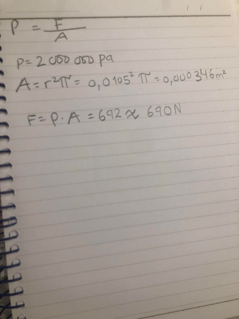 Frågan är "En PET-flaska tål trycket 20 bar innan kapsylen skjuts iväg. Korken väger 2,96 g och har diametern 21 mm, hur stor kraft känner korken av på insidan?