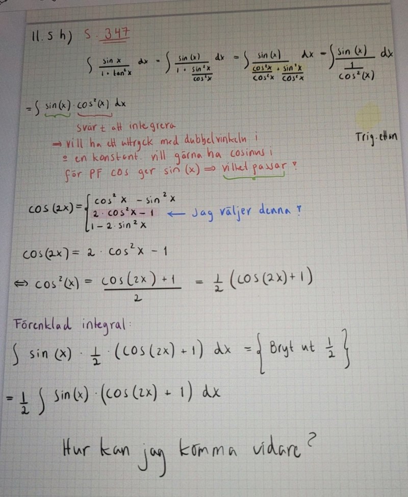 Sin är ju derivatan till cos, så om du sätter cos=t kommer den ätas upp i variabelbytet. Så den var ganska lättintegrerad efter första omskrivningen.