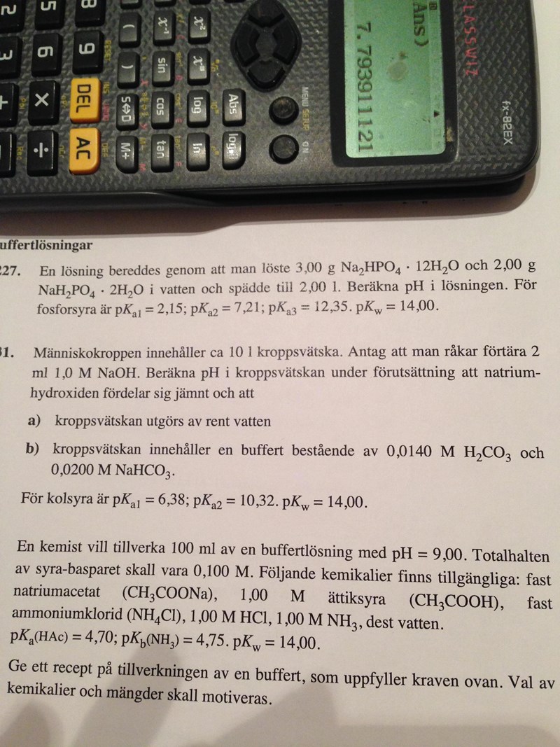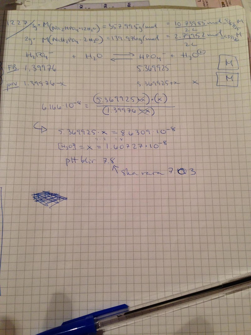 Men sen - när man fått fram vad x är så har man en jämvikt med en viss mängd H3O+ (alt vatten ) som ju skulle kunna reagera med H2PO4- till H3PO4 och vatten (alt OH-) och man har också HPO4^(2-) som skulle kunna reagera med H2O till PO4^(3-) och H3O+.