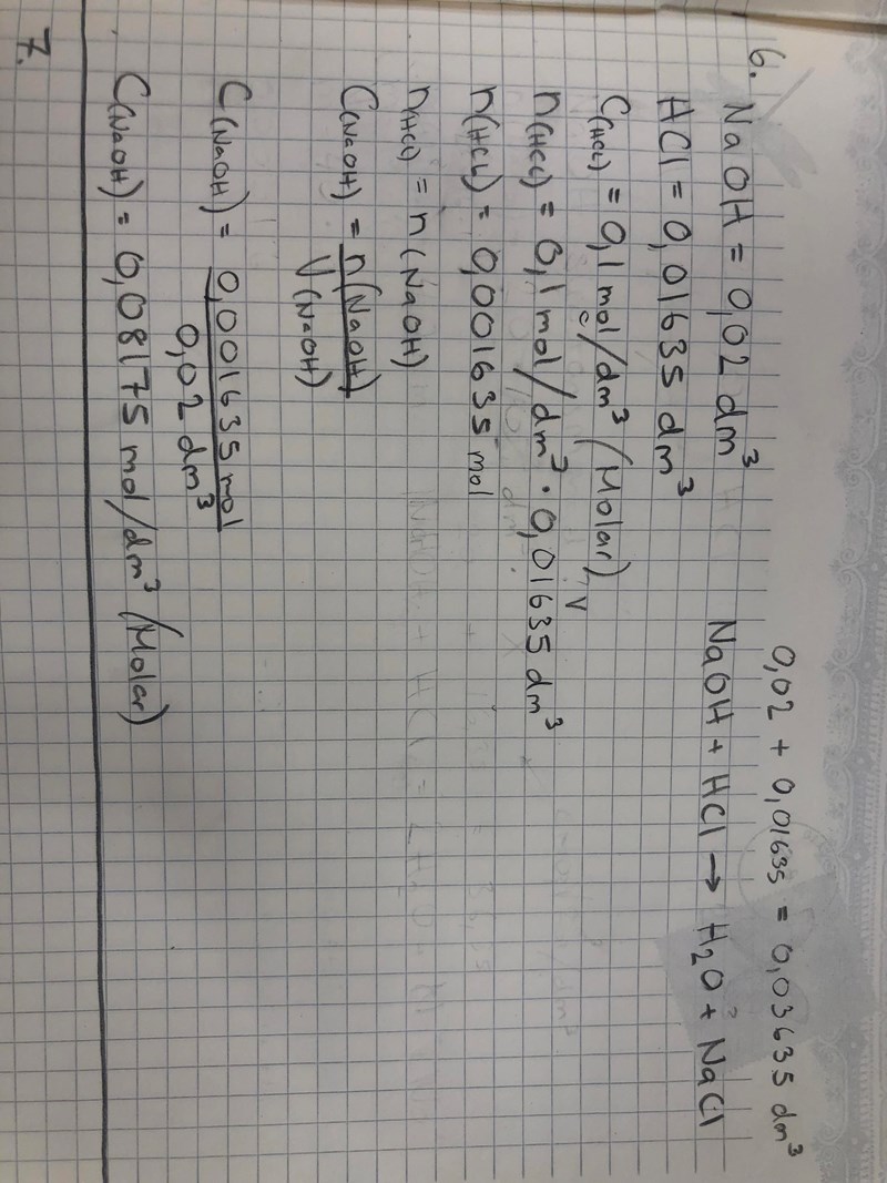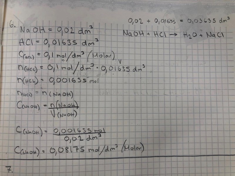 Koncentrationen av en natriumhydroxidlösning (NaOH) bestämdes genom att droppvis tillsätta saltsyra (HCL) med koncentrationen 0,100mol/dm3 tills lösningen blev neutral. (Ekvivalenspunkten vid pH 7 bestämdes med BTB) det gick åt 16,35cm3 saltsyra för att neutralisera 20cm3 NAOH-lösning. Beräkna koncentrationen av natriumhydroxidlösningen.