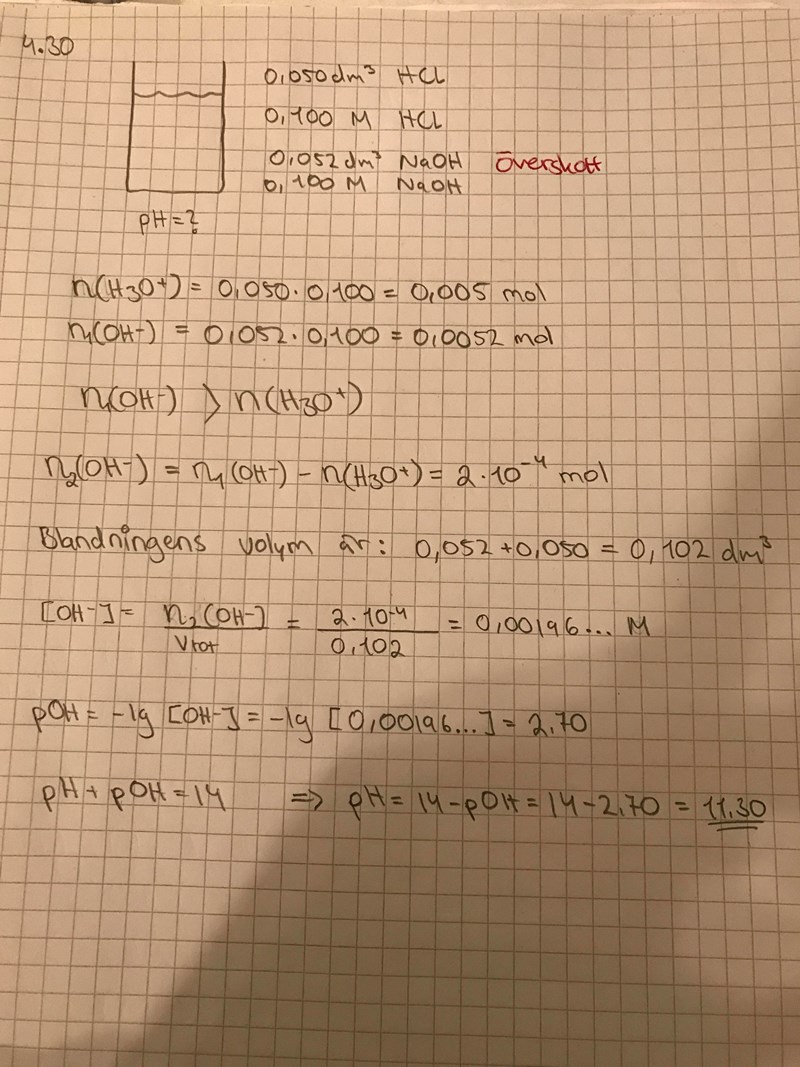 Hej, jag undrar om jag har tänkt rätt i min lösning när jag ska bestämma pH-värdet?