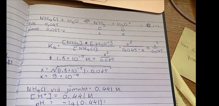 Beräkna pH i en 0,045 mol/dm3 lösning av salmiak (NH4Cl). Kb för ammoniak (NH3) är