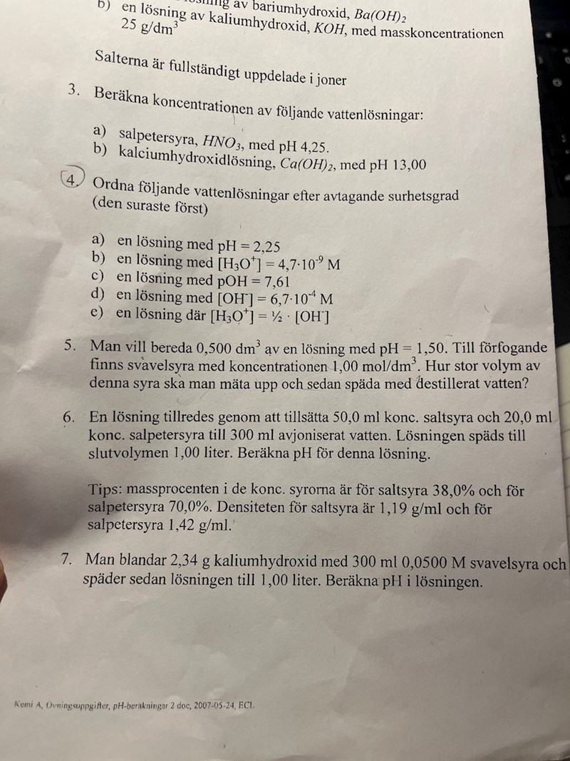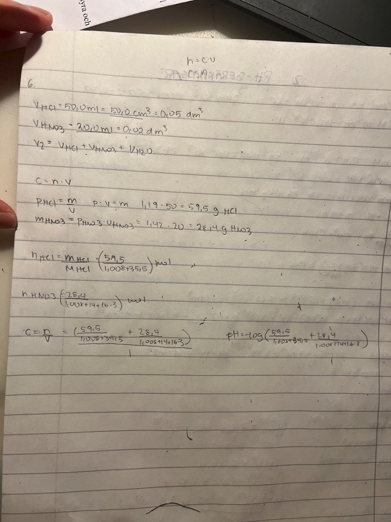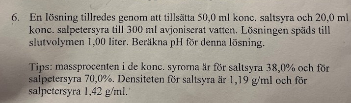 Börja med att anända densiteten, massprocentenoxh molmassorna för att beräkna koncentrationen i konc saltsyra och konc salpetersyra. Det är enklast att räkna på 1 liter av vardera lösningen.