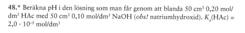 Smaragdalena skrev:Det ser ut som om du försöker räkna med att varje ättiksyramolekyl kan protolyseras två gånger - eller så fattar jag inte alls vad du gör. Eftersom du har tillsatt hydroxidjoner är inte koncentrationer av acetatjoner lika med koncentrationen av oxoniumjoner.