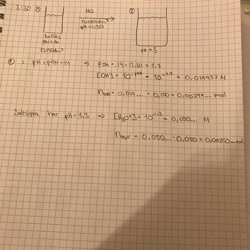Smaragdalena skrev :Hur många mol hydroxidjoner har du? Hur många mol oxoniumjoner? Vilket är i överskott?
