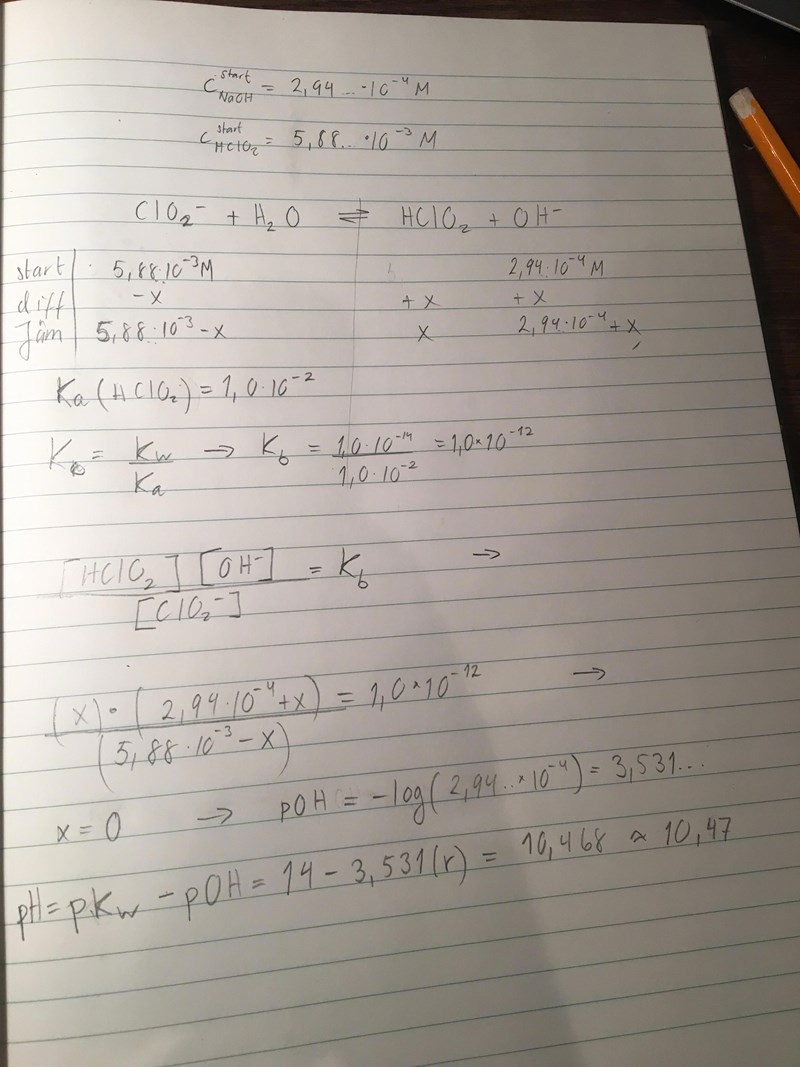 I detta fall använde jag Ka för HClO2. Har ej funnit Kb för NaOH om det finns. Den första koncentrationen är n(NaOH)-n(HClO2)/tot V. Den andra är n(HClO2)/Vtot.