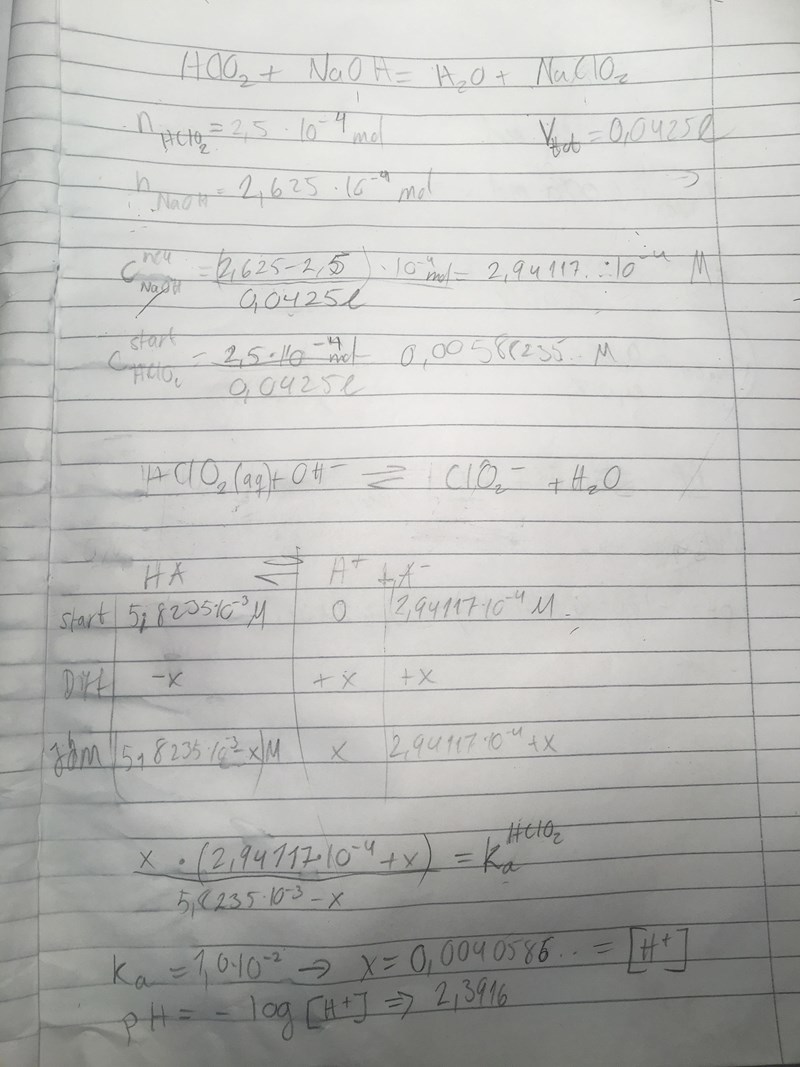 25 ml HClO2 [0,01] titreras med 17,5 ml NaOH [15*10^-3]. Beräkna pH.
