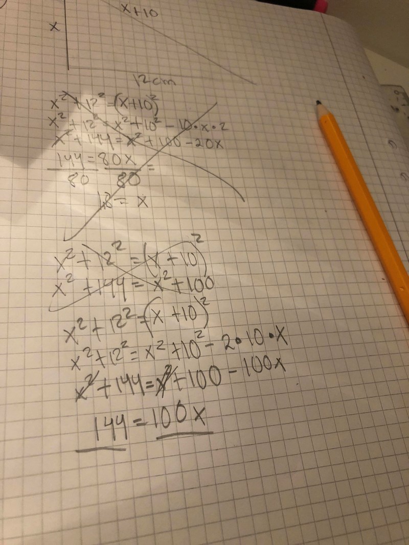 Du vet att en av kateterna är 12cm, och att hypotenusan är 10cm längre än den andra kateten. Ifall vi kallar hypotenusans längd för c hur kan vi uttrycka en andra katetens längd?
